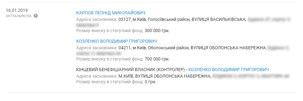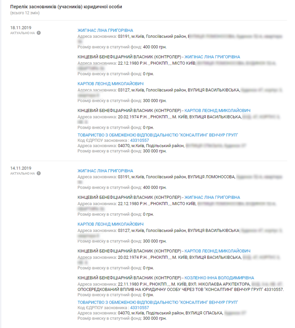 Сама Инна Козленко стала одним из уже трех бенефициаров вместе с Леонидом Карповым и Владимиром Козленко. Уже в середине ноября имя Владимира Козленко пропало из списка учредителей и бенефициаров компании, доля Карпова в 30% в уставном капитале осталась неизменной, еще 30% оформили на ООО «Консалтинг Венчур Груп», а долю в 40%, которая после введения «Консалтинг Венчур Груп» в состав учредителей все еще была оформлена на Владимира Козленко, переоформили на киевлянку Лину Жыгинас. Буквально через несколько дней после этого имена семейной четы Козленко и вовсе исчезли из состава учредителей: теперь там только Лина Жыгинас, Леонид Карпов и «Консалтинг Венчур Груп». Впрочем, Владимир Козленко до сих пор руководит фирмой.