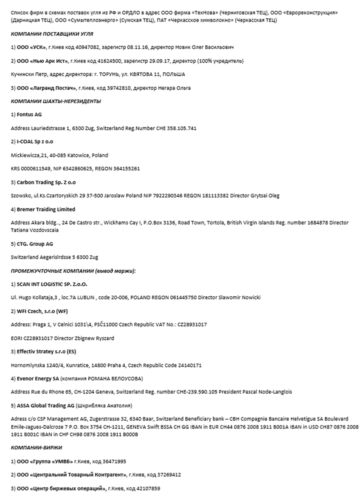 Мазурова же вместе с бизнес-партнером Шкрибляка Романом Белоусовым отвечала за поставки угля. Именно Белоусов организовал поставки угля из РФ и ОРДЛО, вел переговоры с представителями угольных фирм в РФ и представителями в ОРДЛО, часто выезжал в Россию, а оттуда через Ростов на Дону — на оккупированные территории Луганской и Донецкой областей. Белоусов и Шкрибляк владеют там несколькими шахтами и угольными площадками, приобретенными еще до 2014 года, а брат Белоусова занимает высокий пост в МГБ «ЛНР». Кроме того, Белоусов контролирует фирмы-нерезиденты, через которые идут поставки угля, и организует вывод «маржи».