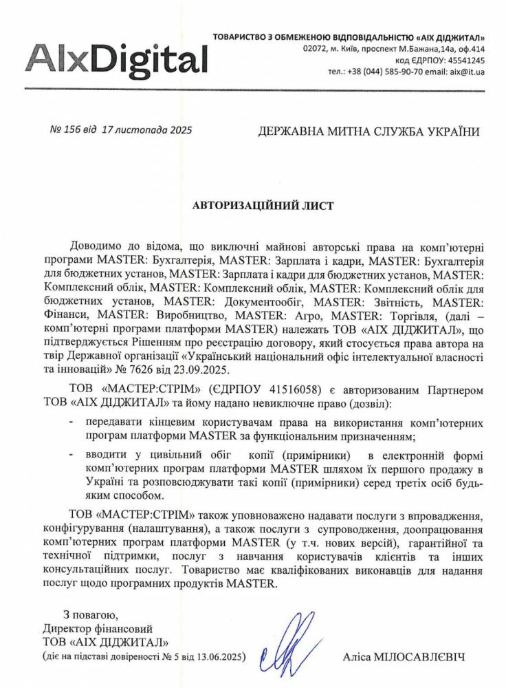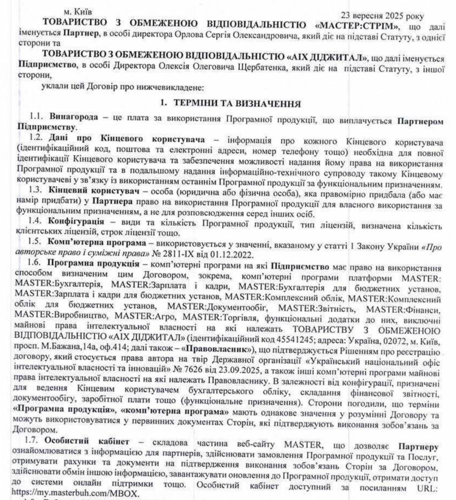 Мова йде про компанію «Мастер:стрім», яка виступає постачальником ПЗ для державних та комунальнх органів влади – комп’ютерні програми «MASTER:Бухгалтерія», «MASTER:Зарплата і кадри», «MASTER:Бухгалтерія для бюджетних установ», «MASTER:Зарплата і кадри для бюджетних установ», «MASTER:Комплексний облік», «MASTER:Комплексний облік для бюджетних установ», «MASTER:Документообіг», «MASTER:Звітність», «MASTER:Фінанси», «MASTER:Виробництво», «MASTER:Агро», «MASTER:Торгівля».