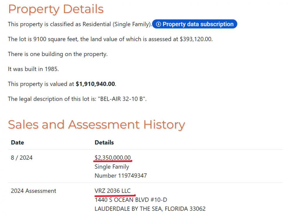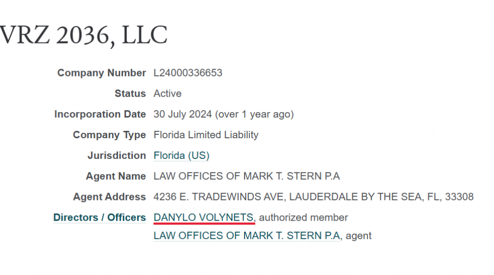 Але дещо Маркарова не задекларувала. У липні 2024-го її чоловік Данило Волинець зареєстрував у США компанію VRZ 2036 LLC. У серпні 2024-го вона купила за 2,35 млн доларів віллу в курортному містечку Помпано-Біч, штат Флорида. У декларації Оксани Маркарової є згадка про американську фірму чоловіка, але нема згадки про нерухомість, яку на неї оформлено.